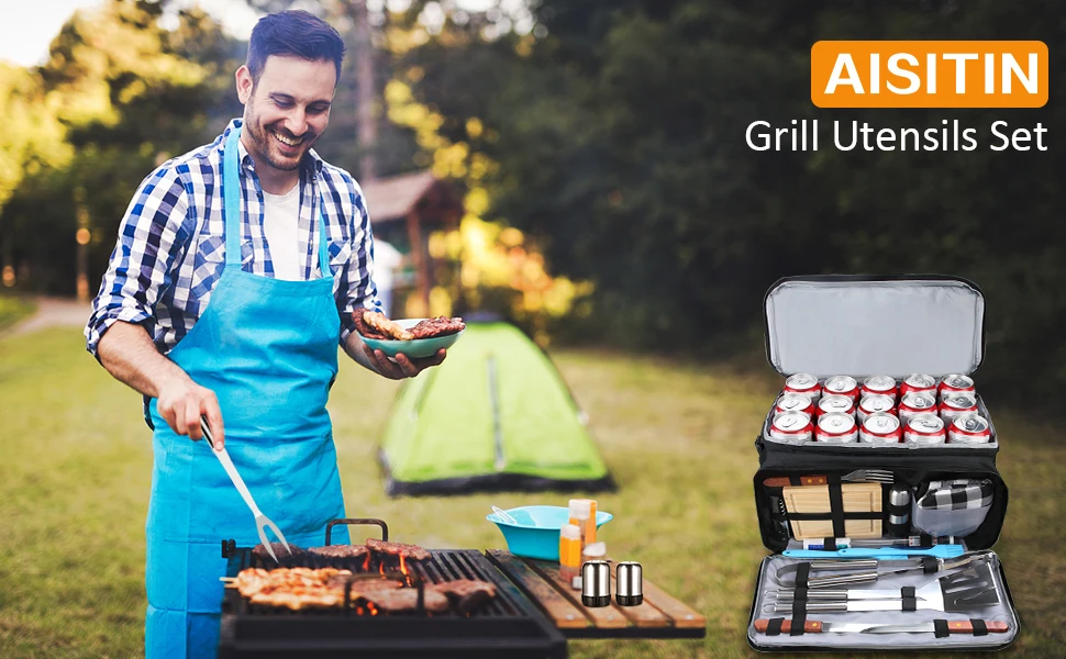 AISITIN BBQ Grill Accessories with Insulated Cooler Bag Stainless Steel Grill Utensils Set BBQ Grilling Accessories BBQ Tool Set